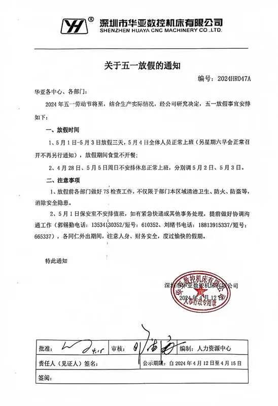 深圳市華亞數(shù)控機(jī)床有限公司關(guān)于五一放假的通知